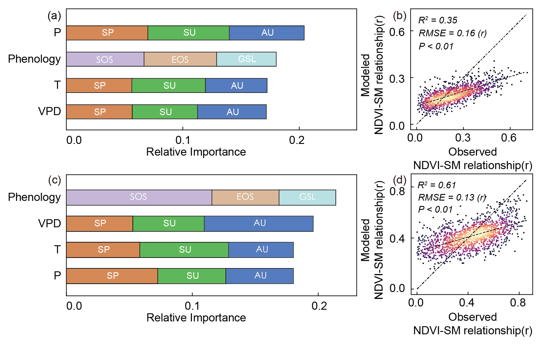 Earlier spring phenology and increased VPD mediate the divergent vegetation-water relationship in the dry period.